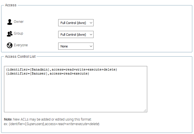 The protection settings grants access to the system, owner, group and world classes are as follows: