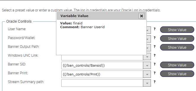 Oracle Controls can either be a hard coded value or a variable location. To see the current value of a variable based Oracle control,click the Show Value button adjacent to the variable chosen from the dropdown.