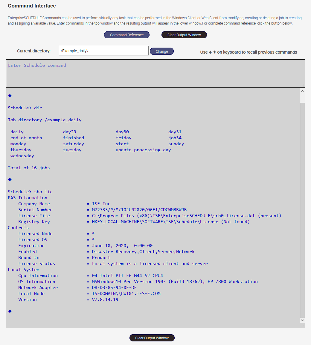 The Web Client Command Interface can be used to issue a wide range of commands to perform many scheduling tasks. This includes creating and modifying jobs, variables and calendars and displaying useful information about the system. For a complete reference of EnterpriseSCHEDULE commands, click on the Command Reference button.