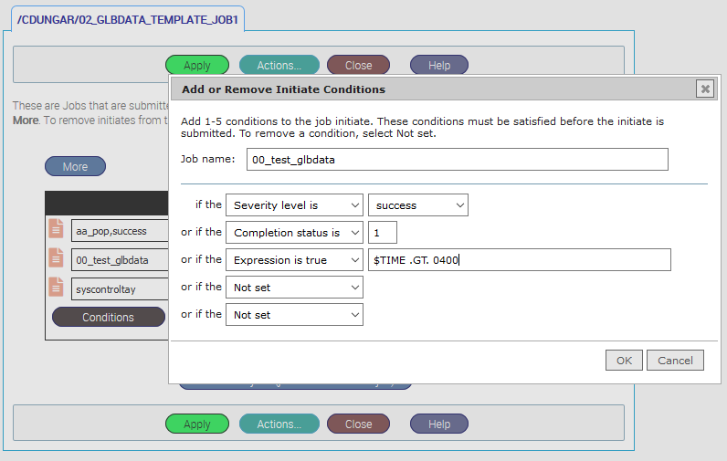 Each initiate branch can be conditioned only to occur under certain circumstances. Any of the conditions being true is enough to allow the initiate to execute (OR condition). The following conditions can be applied to an initiate: