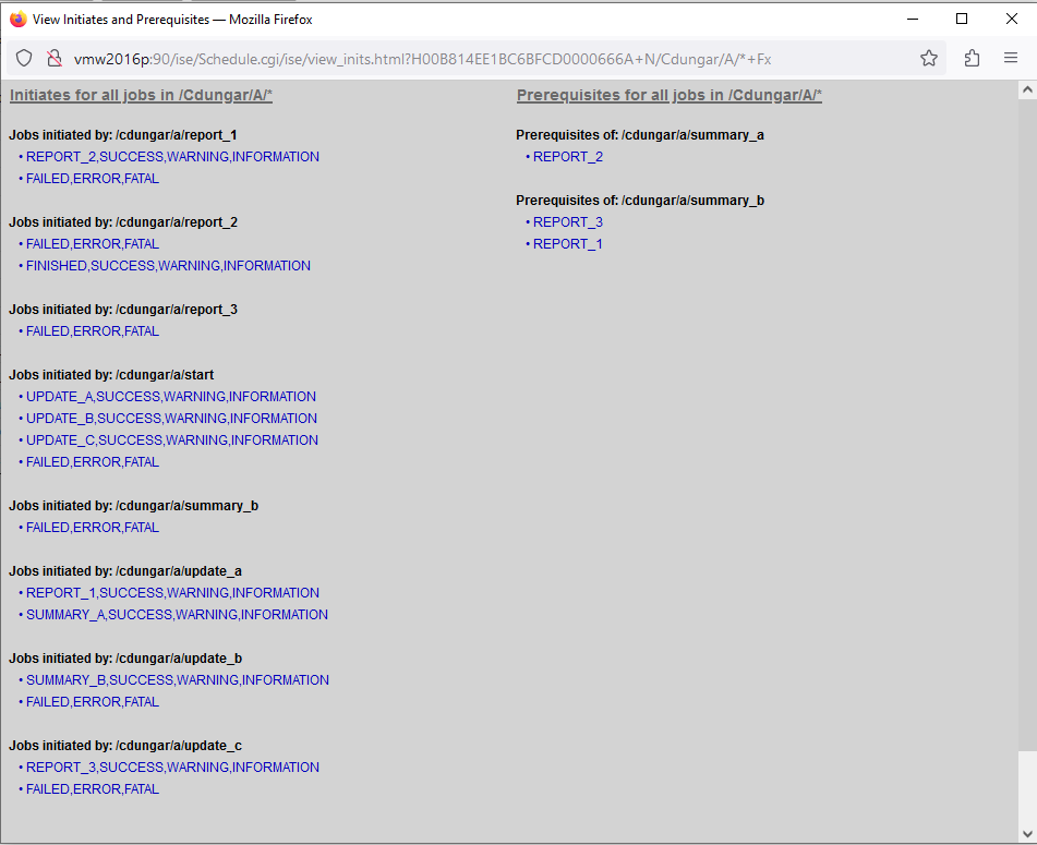 To view a list of all initiates and prerequisites in a directory, right Click on a directory and select View Job Initiates and Prerequisites. The display will show initiates and prerequisires for all jobs in the directory.