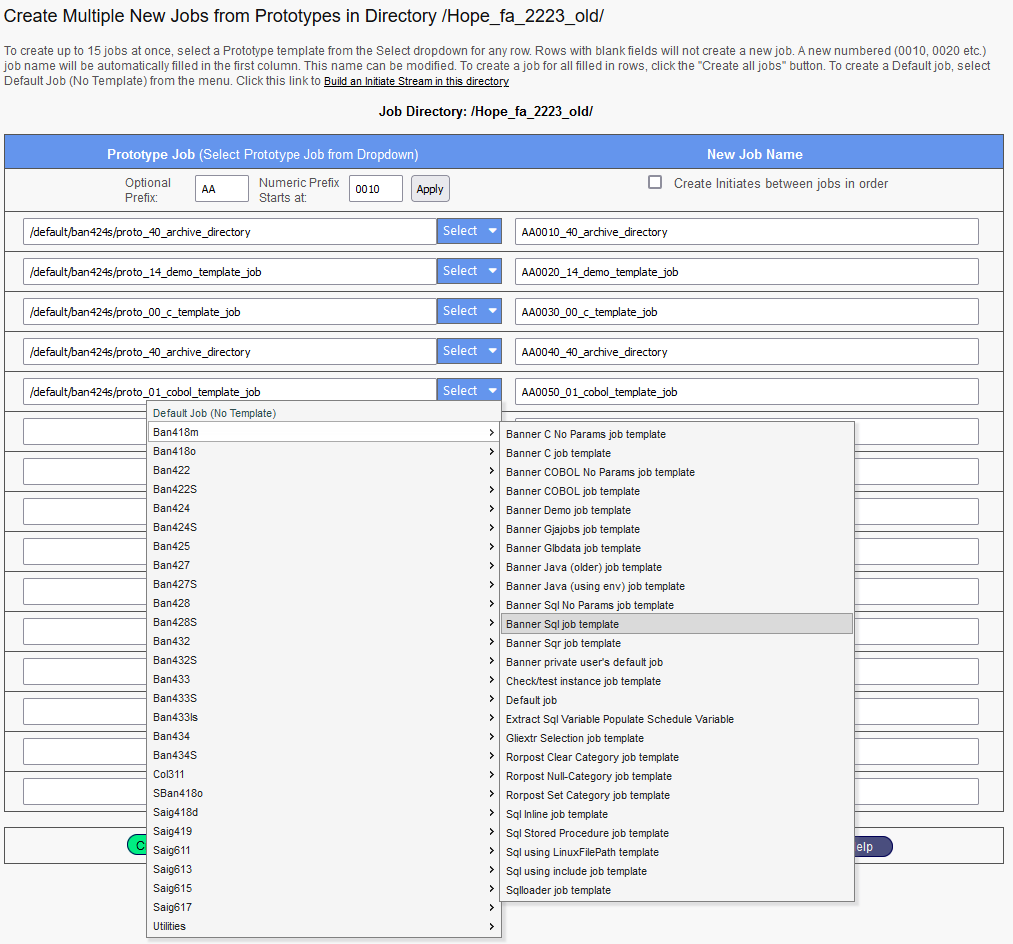 Select the Prototype job (Template) that each job will use by clicking the Select dropdown on each row you want to create a job. The job will be named by appending the Numeric prefix to the name of the job in the template. The name in the Job Name column may be edited any time before creating the job. To select a Default job not based on a template, choose Default Job (No Template).