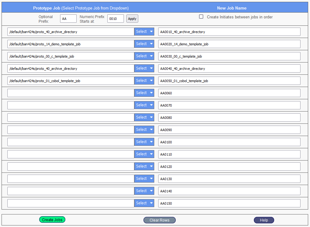 Rows with blank fields will be skipped in the Create process. A new numbered (0010, 0020 etc.) job name will be automatically filled in the first column. An Optional Prefix may also be appended top all jobs in the list by entering the prefix in the Optional Prefix field. This name can be modified.