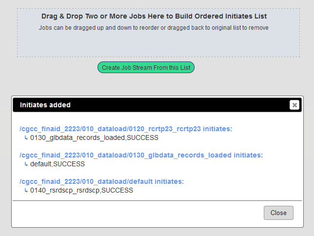Once the list is built up, it may be reordered by dragging jobs up and down or jobs may be dragged back to the original job list. When the list is ready, click Create Job Stream from List. This creates permanent initiate links that initiate upon SUCCESS. Arrows indicate the initiate connection that will be made.