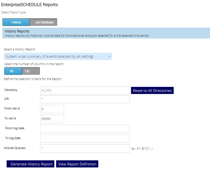 Reports can be created of History data for Jobs and the Contents of the Job Database. Reports can be 80 or 132 columns. A wide variety of Reports are provided based on several criteria.