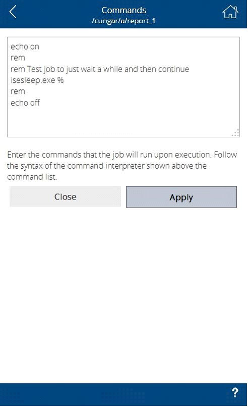 The command list or script. In order to edit the command list, touch inside the command textarea and type the command list in the format of the command interpreter. Touch Apply to save.
