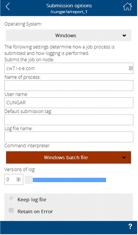 The Submit options determine how jobs are submitted in EnterpriseSCHEDULE. EnterpriseSCHEDULE gives you the choice of which Operating System to submit the job on. The choices are: Windows, UNIX and VMS. Depending on which Operating System you choose the screen will change with the correct submitting options. The user can submit a single job or a job set.