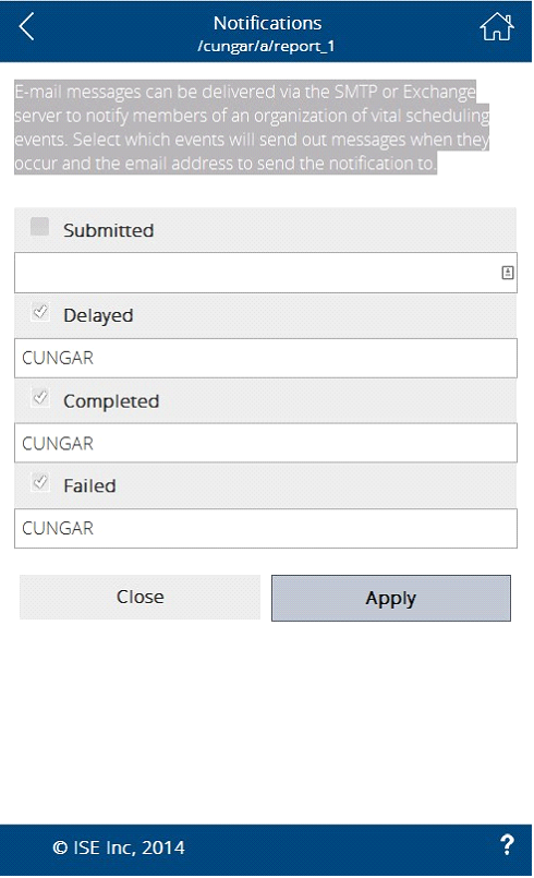 E-mail messages can be delivered via the SMTP or Exchange server to notify members of an organization of vital scheduling events. Select which events will send out messages when they occur and the email address to send the notification to.