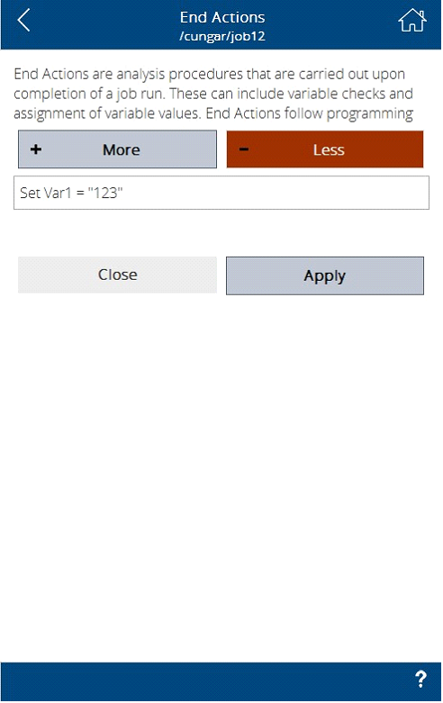 End Actions are analysis procedures that are carried out upon completion of a job run. These can include variable checks and assignment of variable values.