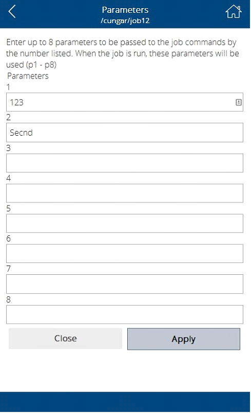 Enter up to 8 parameters to be passed to the job commands by the number listed. When the job is run, these parameters will be used (p1 - p8)
