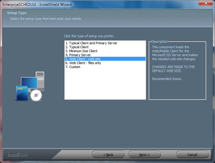 The Web Client can be automatically installed using the EnterpriseSCHEDULE Windows Client/Server installation executable by choosing 5. Web Client - web site during installation. Click Next to continue and complete the Installation. This procedure also installs and configures Internet Information Services (IIS) on the server.