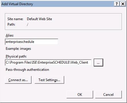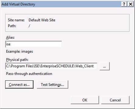 1)Create Virtual directory ise (and later enterpriseschedule) in location c:\Program Files\ISE\EnterpriseSCHEDULE\Web_Client\ as shown below: