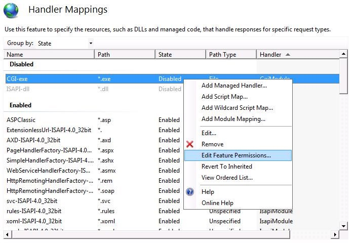 a.Right click on CGI-exe from the list of Disabled mappings and select Edit Feature Permissions from the drop down menu and proceed to step d. If the mappings are already enabled CGI is already enabled.