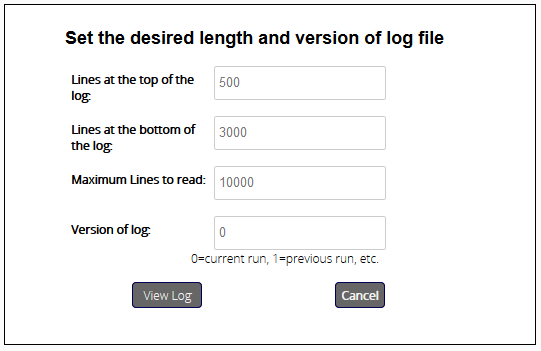 To View a Specific log and determine how much of the log to display select View Specific Log from the Job Action Menu. The following screen will appear. The fields are described below.