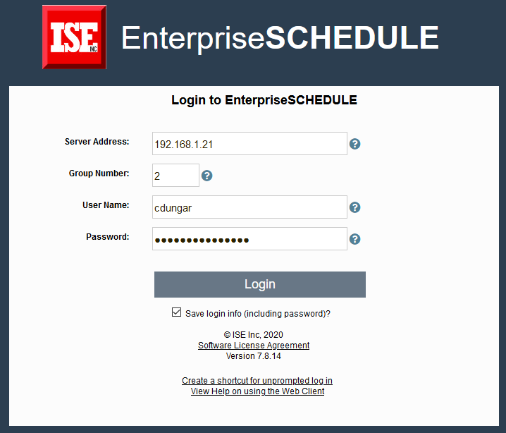 The first time you start EnterpriseSCHEDULE Web Client, you will be asked to log in. To do so just type in the server address, the group number, your username and password. This will establish a record for your user name and password in the server database which will be utilized the next time you log in. The server address, group number and username will be retained in the login screen the next time you log in. Log in using the user name and password which you use for the server on which EnterpriseSCHEDULE is installed.