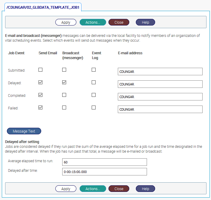 Notifications may be sent via E-mail, Windows Event Log (Windows jobs only) or to a Windows Messenger window. Check off the desired type of notification (E-mail, Event Log or Messenger) for each type of event. You may select either, both or neither type of notification.