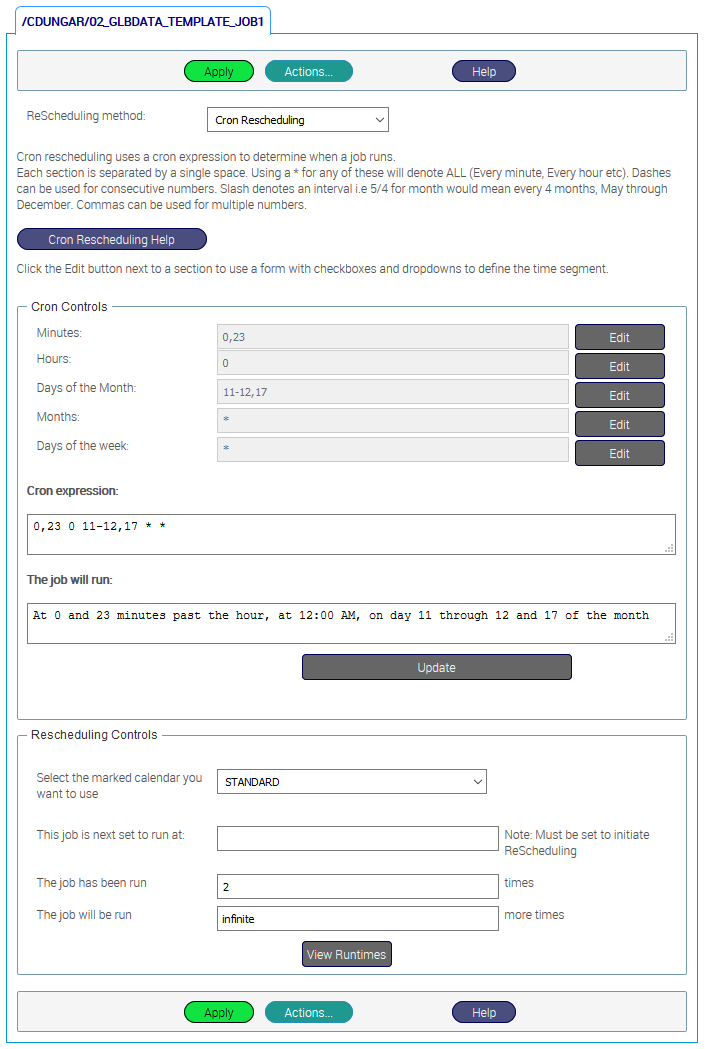 EnterpriseSCHEDULE allows jobs to be scheduled using a 5 segment Cron string that designates Minutes, Hours, Days of the Month, Months, and Days of the week. The Web Client can be used to construct the Cron Expression using handy forms with dropdowns and checkmarks. The expression may also be entered manually in the main form following the syntax guidelines outlined below.
