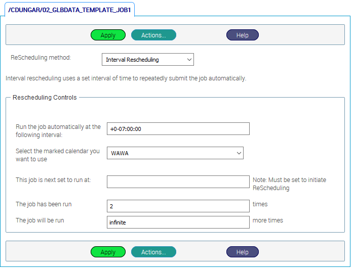 This is the next time this job is set to run. If this field is set to "not set" then this job will not start unless initiated by another job or manually by a submit request from the user. All rescheduling rules only take affect when this job is activated, by setting this field to an initial date. |