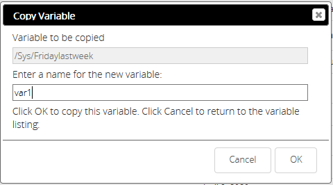 Select Copy Variable from the Variable Action Menu to copy the currently selected variable. Enter the name of the new variable in the new variable field. Click OK to copy.
